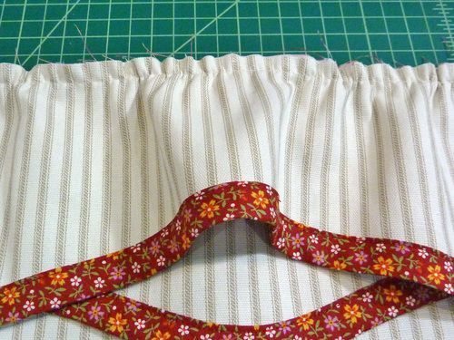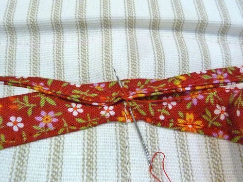 Em seguida, corte tiras de tecido e costure uma na outra, para formar o viés.