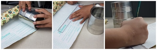 Para começar, meça as dimensões da lata e transfira-as para o contact com a ajuda de uma régua. Lembre-se de repetir o processo três vezes, já que são três latas para revestir!