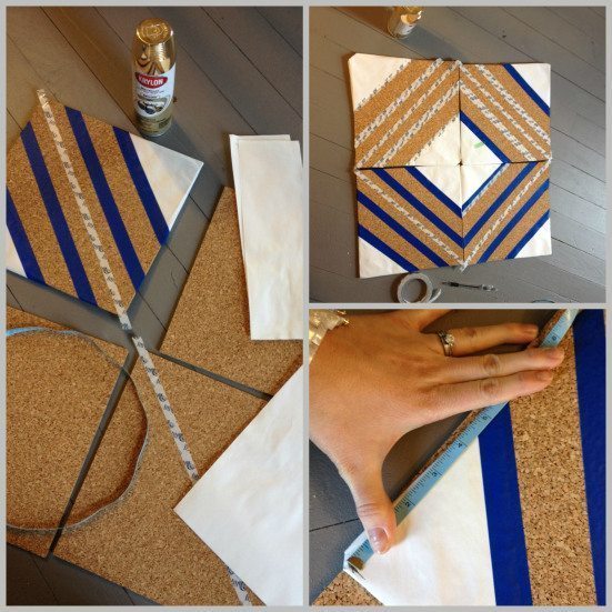Comece decidindo o formato que você quer para o seu painel de cortiça. Neste modelo que estamos apresentando o painel é composto por quatro partes que formam um quadrado, mas nada impede que você faça o seu painel com o formato que você quiser. Decidido o formato, decida a posição dos detalhes que você quer para decorar o seu painel. Então, com tudo decidido, corte a cortiça com o formato desejado e posicione pedaços de fita adesiva e também pedaços de papéis sobre a cortiça, deixando expostas as partes que você quer pintar.