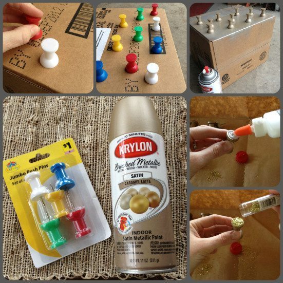 Logo após, posicione os pinos e tachinha na caixa de papelão, se você quiser, e pinte com a tinta em spray com a cor de sua preferência. Deixe secar a tinta e depois aplique cola e jogue glitter na parte superior do pino ou aplique nesta parte a cola com glitter ou uma tinta que já possua glitter.