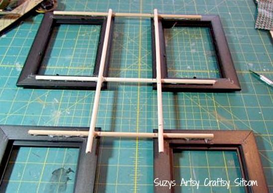 Em seguida, desmonte todos os seus porta-retratos e cole a parte detrás das molduras com o auxílio de palitos e madeira. Utilize a cola quente ou uma cola tudo, de acordo com a sua preferência.