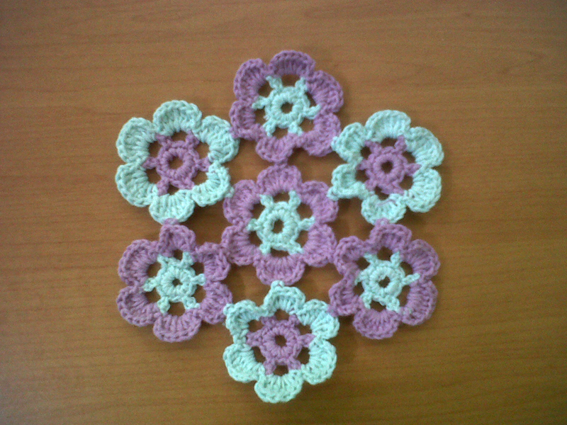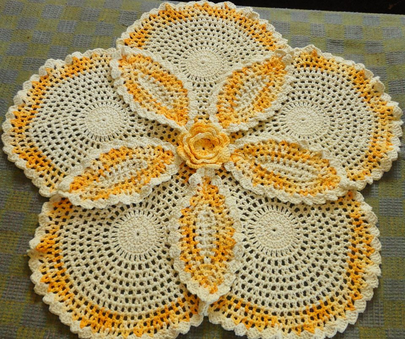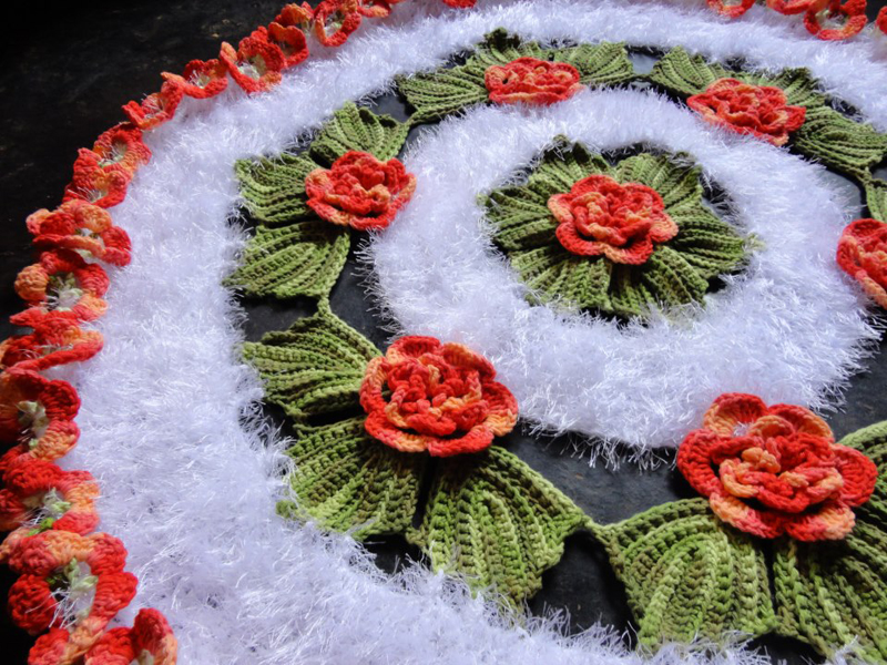 A toalha de crochê para cozinha da imagem a seguir é ainda mais fácil de ser feita. Você deve fazer 5 círculos iguais de crochê e, com o modelo que você quiser. Aqui, os círculos de crochê foram feitos de forma bem simples, apenas com correntinhas e pontos altos. Assim que fizer os 5 círculos, você vai costurar à mão uma parte da borda de um círculo à outra borda de outro círculo e abrir (essa costura cria os detalhes entre os círculos). Mas tenha cuidado para manter as cores bem alinhadas, caso faça peças coloridas como na imagem. Para finalizar basta fazer uma florzinha e costurar no meio, pois no meio vai ficar um furo.