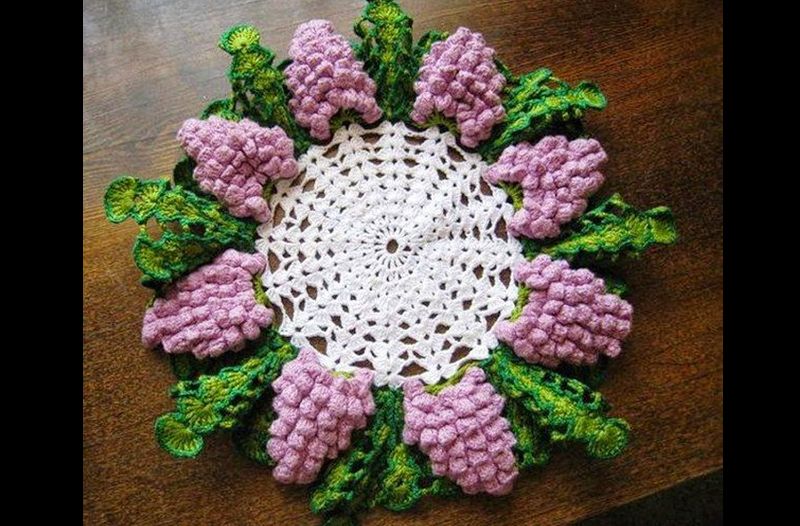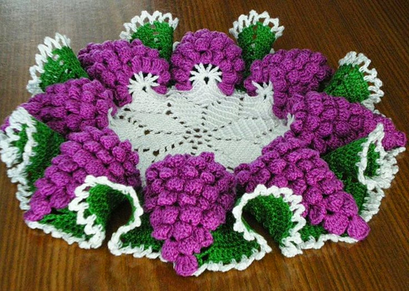 A toalhinha de crochê com cacho de uvas, que você vai ver a seguir, não é difícil de ser feita. Você faz o centro com uma linha branca e com o modelo que você desejar, apenas a última carreira branca deve ter espaços para você acrescentar o cacho de uvas. Faça carreiras com a linha verde de forma bem embabadada, ou seja, com muitos pontos, para ficar sobrando e com quadradinhos de correntinhas e pontos altos onde os cachos de uvas serão feitos. A última carreira, com os picôs, pode ser branca ou verde. Os cachos de uvas são feitos com ponto pipoca nos quadradinhos da parte verde. Mas caso você não consiga fazer o cacho de uva já na toalhinha, você pode fazer separado e costurar à mão por cima da parte verde.