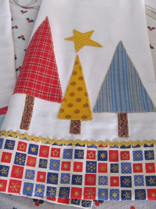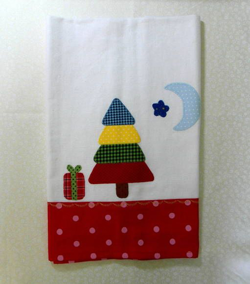Outra aplicação linda e, relativamente fácil, é o pano de prato decorado com fuxicos formando uma árvore de Natal. Os detalhes e outras aplicações neste caso também podem ser as que você desejar.