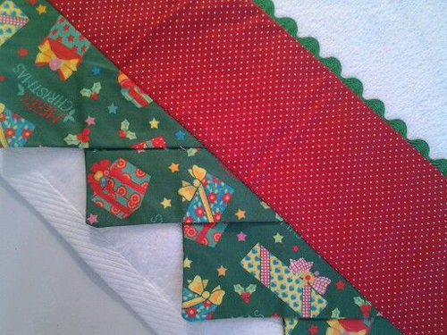 E você nem precisa costurar ao redor, caso você não saiba nem costurar à mão ou não possua um máquina de costura, pois você pode apenas recortar os pedaços de tecido e colá-los sobre o pano de prato. Utilize cola para tecido, que é indicado para este caso. E você nem precisa fazer barrado em seu pano de prato.