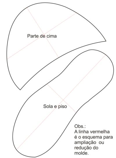 Esta pantufa possui tamanho número 37, para ampliar ou reduzir basta aumentar onde está marcado com as linhas vermelhas.