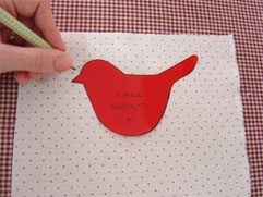 – Com o tecido pelo avesso faça a marcação do molde de pássaro, depois dobre o tecido de modo que fique direito com direito, fixe com alfinete e corte, deixando cerca de 1cm em torno de todo o molde;