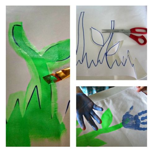 Em seguida, posicione o molde sobre o avental, e pinte toda a parte da grama, dos caules e das folhas, com a tinta verde e o auxílio do pincel. Deixe a tinta secar muito bem antes de partir para a próxima etapa, para que não borre o caule.