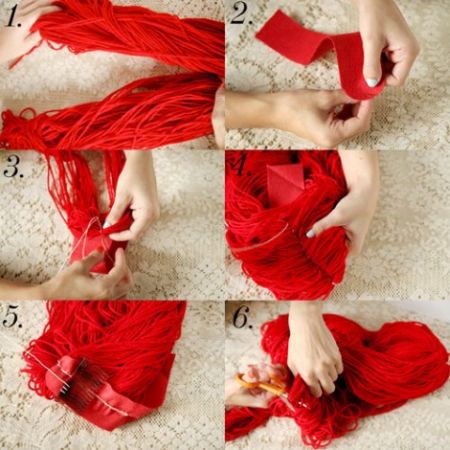 Para fazer esta divertida peruca de lã você irá precisar de: lã vermelha (ou com a cor de sua preferência); feltro vermelho (ou feltro com a mesma cor da lã, caso você tenha escolhido outra cor para fazer a peruca); 2 presilhas-pente; barbante fino ou linha grossa para fazer crochê (aqui foi usado uma linha com a cor branca, para dar destaque e parecer o cabelo de boneca, porém você também pode usar uma linha com a mesma cor da lã); e agulha de mão com orifício com tamanho suficiente para passar a linha grossa ou o barbante fino.