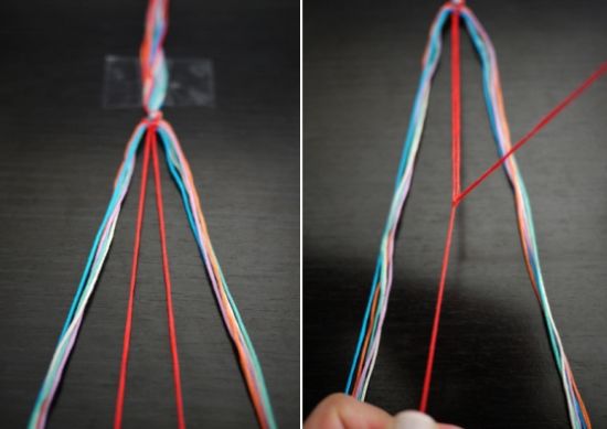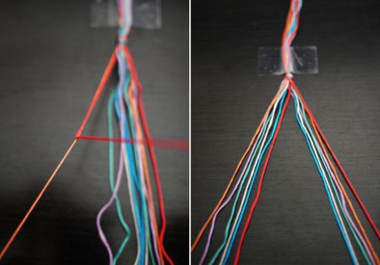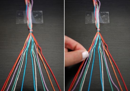 Comece posicionando pedaços de linhas de bordado com medida de 24 cm de comprimento sobre uma superfície, dando um nó para começar (deixando 3 cm de sobra de linha) e prendendo estas linhas com um pedaço de fita adesiva. Neste momento você pode posicionar as cores das linhas da forma que você quiser. Lembrando que quanto mais colorida for a combinação de cores mais interessante será a sua pulseira. Porém se você não gosta se peças coloridas você pode fazer uma pulseira de uma cor única, com sua cor preferida.