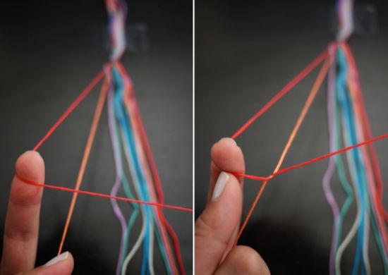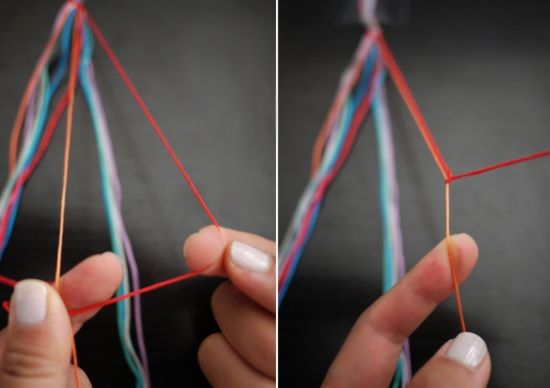 Agora, pegue a cor mais externa do lado direito e faça um nó para trás, criando um “4” ao avesso sobre a segunda cor, colocando novamente para trás através da abertura. Puxe para cima e para a esquerda para apertar. Não se esqueça de dar nó duas vezes em cada cor. Continue atando para a esquerda até que a linha da outra extremidade atingir o meio do trabalho. Dê um nó para trás com as duas linhas do meio para conectar as duas metades.