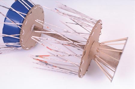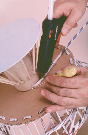Em seguida, para o acabamento da base de bobina de papelão inferior, recorte uma circunferência de 20 cm e cole para servir de base inferior. Em seguida, cole 26 palitos de churrasco na posição diagonal imitando o formato de um cone. Entre um palito e outro deve haver uma distância aproximada de 4 cm.