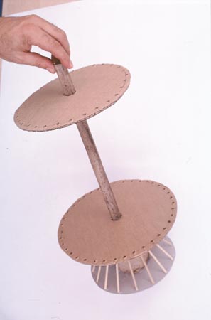 Comece cortando as duas bases de papelão, conforme medida dos diâmetros das bacias. Marque o centro de cada um dos papelões e faça um furo que seja suficiente para passar o cabo de vassoura, mas sem deixá-lo folgado. Apoie o primeiro papelão em cima da base de bobina e cole. Ela sustentará a primeira base da fruteira de 35 cm de diâmetro. Meça de cima para baixo, aproximadamente 5 cm e fixe a segunda base com o diâmetro de 25 cm.