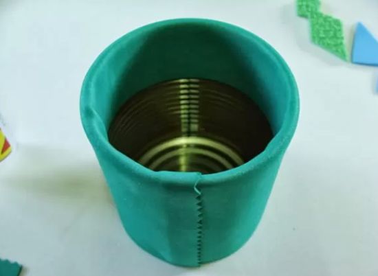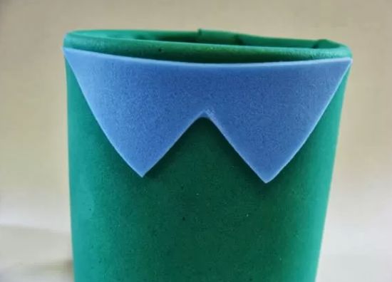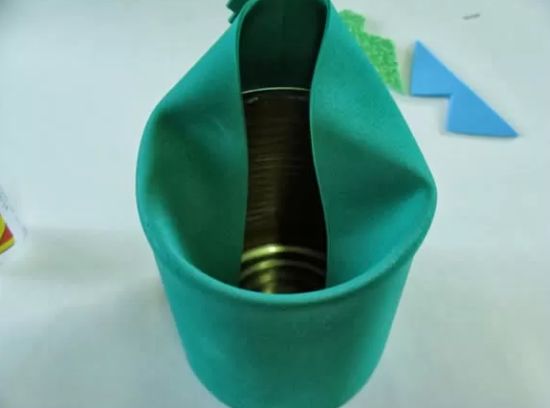 Transfira o molde do colarinho para o EVA azul e corte. Centralize o colarinho na parte superior da lata e cole com a cola quente.