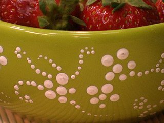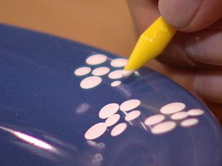 Comece utilizando o boleador e a tinta vitrificável branca. Com o material em mãos faça pontos por toda a louça (na borda, pela parte de dentro) de diferentes espessuras.