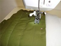 Passo 03 – Prender os tecidos com alfinetes e costurar sobre os riscos (comece pelo centro para o tecido não sair do lugar), faça o mesmo com o tecido estampado;