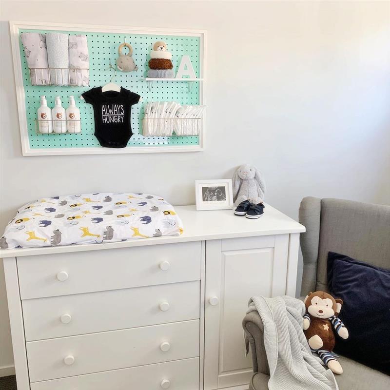 Ter um espaço para colocar bilhetes, adesivos e figurinhas é um outro jeito de deixar esse tipo de pegboard mais interessante e especial. Ou até mesmo itens do bebê.