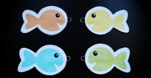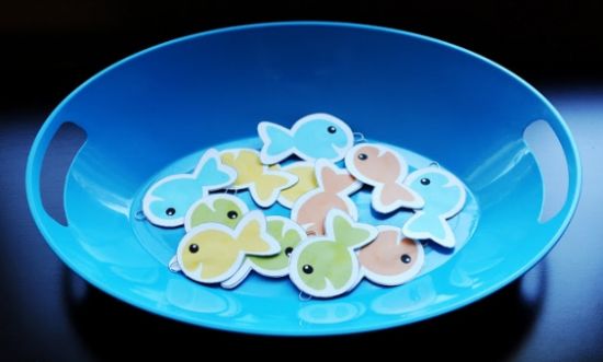 Imprima quantos peixinhos você quiser e recorte-os. Cole junto os dois lados do peixinho e fixe um clipe de papel no meio dos dois pedaços, para servir de gancho. Faça isso com todos os peixinhos que imprimiu.