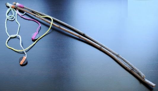 Para fazer a vara de pescar você deve colocar um pouco de cola em uma das extremidades da vara e enrolar um pouco do barbante colorido ao redor da ponta da vara. E em seguida, passe também um pouco de cola no imã e enrole um pouco da outra extremidade do barbante ao redor de todo o imã.
