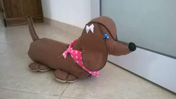 O fofo cachorro feito com garrafa pet e feltro ou tecido decora o seu piso, além de proteger a porta de batidas violentas.