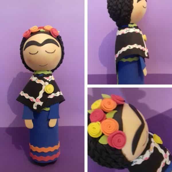 O EVA pode decorar a garrafa pet para virar o peso de porta que vai decorar o seu chão. Vale até criar uma obra de arte, como uma bonequinha Frida Kahlo em EVA.