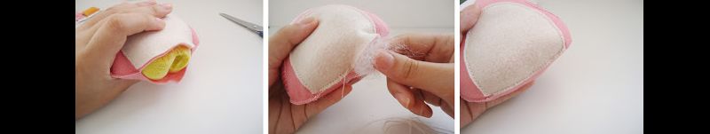 Costure a parte detrás na parte da frente, mas deixando uma abertura na base. Coloque a areia dentro de alguns sacos de plástico, amarre e coloque dentro da coruja. Para ficar mais bonito, coloque também um pouco de enchimento. Termine de fechar.