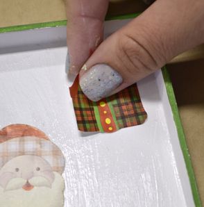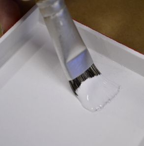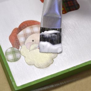 Em seguida, aplique uma camada da cola para decoupage Hidromax na região onde deseja a decoupage. Aqui aplicamos nos cantos e no centro da bandeja. Posicione os papéis sobre a cola pressionando bem, eliminando assim possíveis bolhas e rugas, e aguarde a secagem.