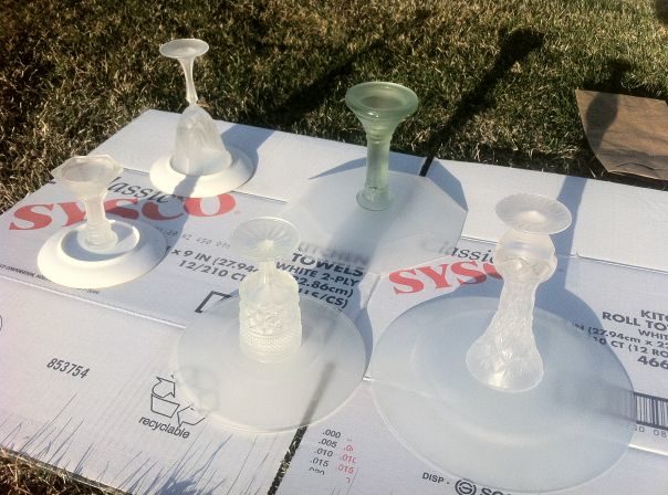 Comece separando todos os materiais que você vai utilizar em seu aprendizado de como pintar vidro com tinta spray. Coloque as peças de vidro sobre o forro.