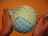 Para fazer a folha, você usa um pedaço de tecido verde. Costure em volta e amarre com um arame fino.