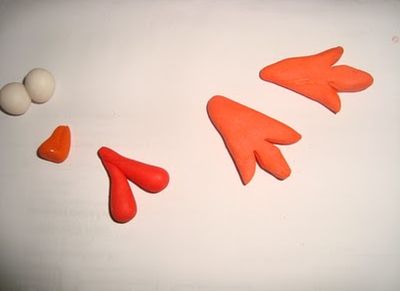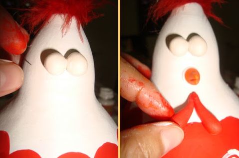 Com a massa de biscuit faça as patinhas, olhinhos, o bico e o “papo da galinha”.