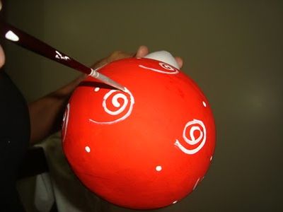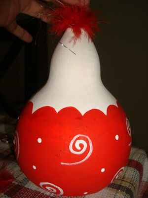 Para fazer a galinha pinte com tinta acrílica decorativa a parte de cima de branco e a “barriga” da cabaça de vermelho e fazendo curvinhas em vermelho na junção das duas cores. Em seguida, faça “caracóis” e pontinhos com tinta branca na parte vermelha.