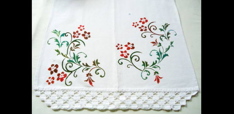 Se você não tem habilidade com pintura à mão livre, pode pintar o seu pano de prato ou o seu pano de copa com um estêncil. Basta posicionar o estêncil sobre o tecido, umedecer a broxinha na tinta dar “batidinhas” sobre a parte com estêncil. Este estêncil pode ser feito em sua casa, por você, com cartolina ou papelão de uma caixa de cereal, por exemplo. Desenhe o contorno no papelão ou na cartolina e recorte o contorno, retirando a parte interna.