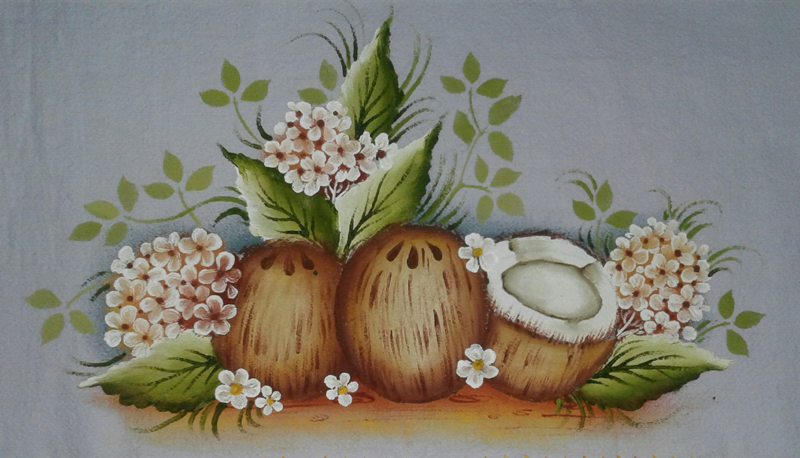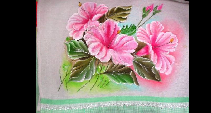 Transfira o risco para o tecido, com o auxílio do papel-carbono. Forre o local onde você vai trabalhar com a sua peça, com jornal velho, papel velho, papelão, tecido velho ou plástico. Comece a sua pintura pelo sombreado, umedeça um pincel mais largo na cor escolhida e vá aplicando com delicadeza ao redor de todo o desenho. Neste caso ao sombreado é pequeno, então use pouca tinta e esfregue bastante o pincel nos locais a serem sombreados. Escolha um motivo, botão, folha ou rosa e aplique a primeira cor, a cor que será a base, e pinte todo este espaço. Vá fazendo os detalhes com pincéis menores, sempre pincelando com delicadeza, começando com mais tinta, para ficar mais forte a cor, e terminando bem leve, para ficar mais suave. Faça isso até completar todo o desenho.