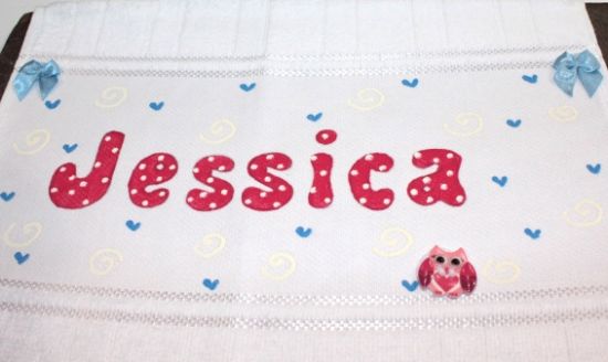 Cole o botão de coruja com a cola para tecido na parte de baixo (ou na posição que você quiser) e cole também os lacinhos um de cada lado da parte superior de onde está o nome. E está pronta sua toalhinha!