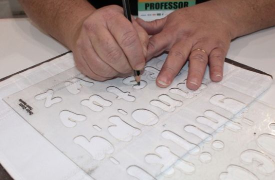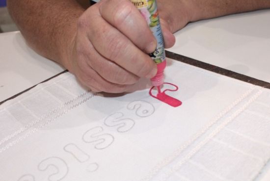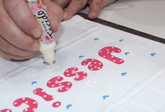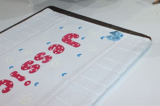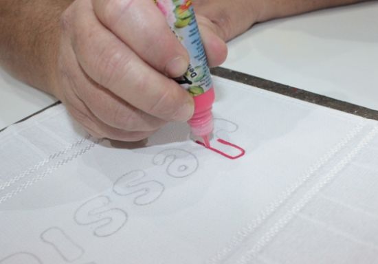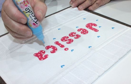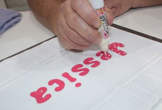 Comece “escrevendo” o nome na toalha. Para isso meça direitinho o espaço e centralize as letras.