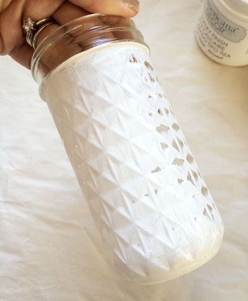 Em seguida, aplique uma camada de verniz em toda a parte externa de seu vaso de vidro, para que o verniz seja um primer para a sua pintura. Deixe secar. Depois aplique uma camada da tinta giz com a cor branca por todo o vaso, para servir como base da sua pintura. E deixe secar.