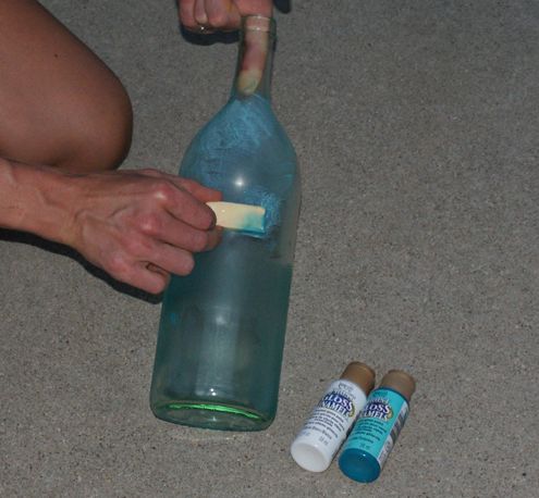 Em seguida, com o mesmo pedaço da esponja para maquiagem que usou anteriormente e que está com os resquícios da tinta azul, pinte a parte da metade de sua garrafa, mas misturando com um pouco de tinta branca, para clarear o tom de azul e começar o degradê de sua pintura.
