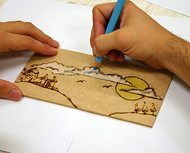Para que possa utilizar o pirógrafo na temperatura certa, de acordo com o material que você irá utilizar, é preciso que você consulte o manual de instruções do aparelho. O pirógrafo irá queimar e marcar as zonas que você irá desenhar no 2º passo, fazendo com que fiquem bem delineadas.