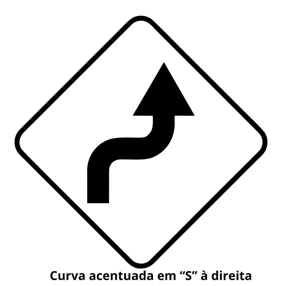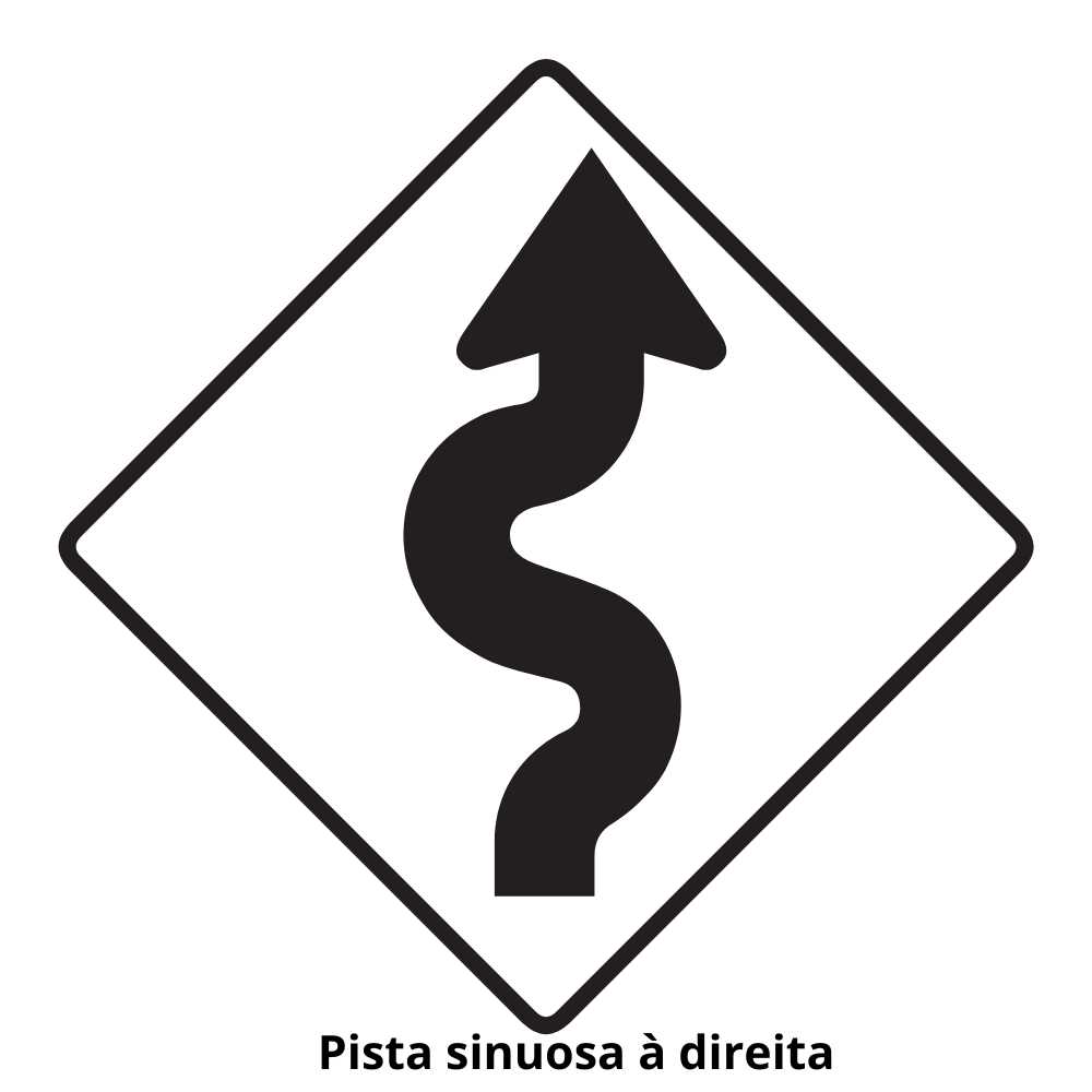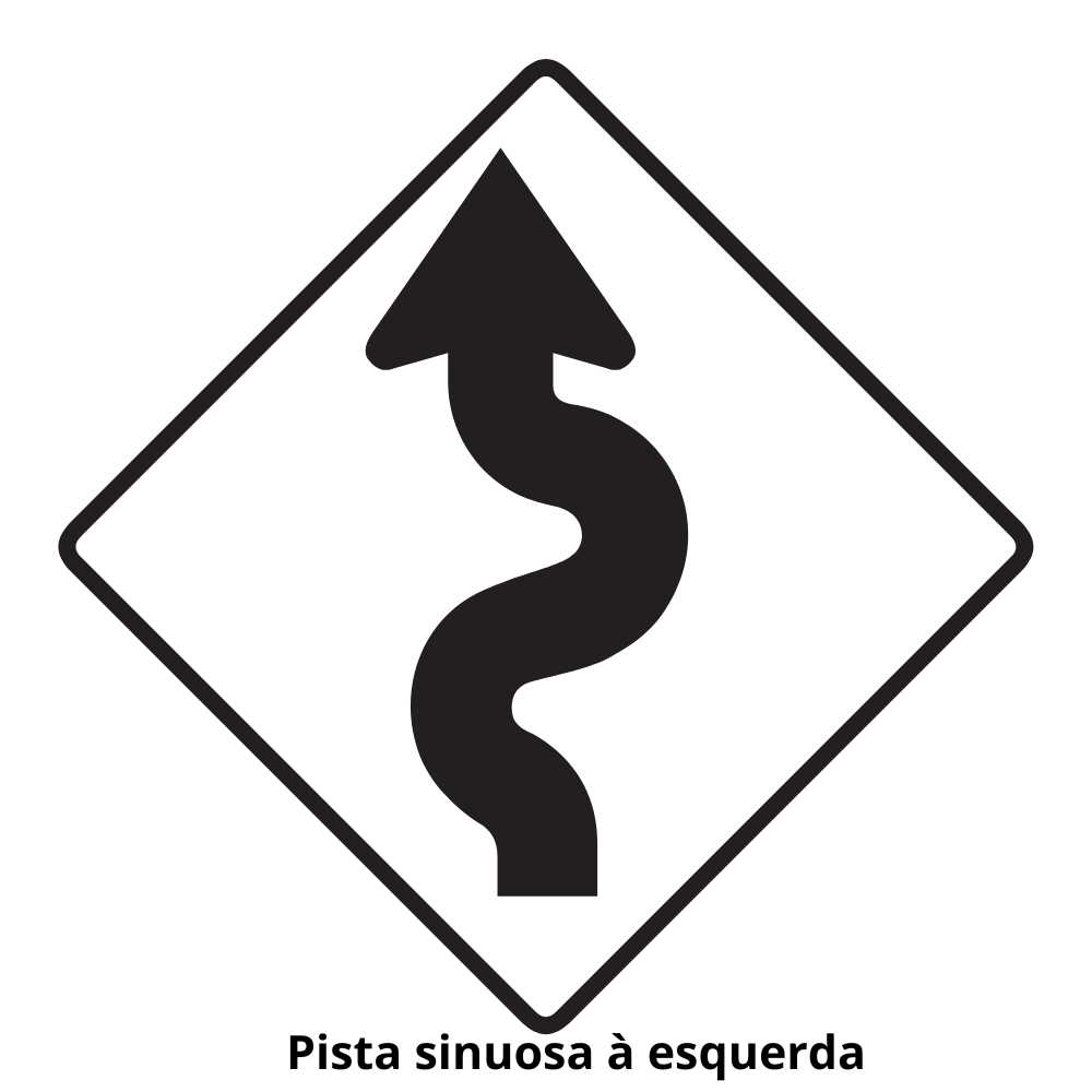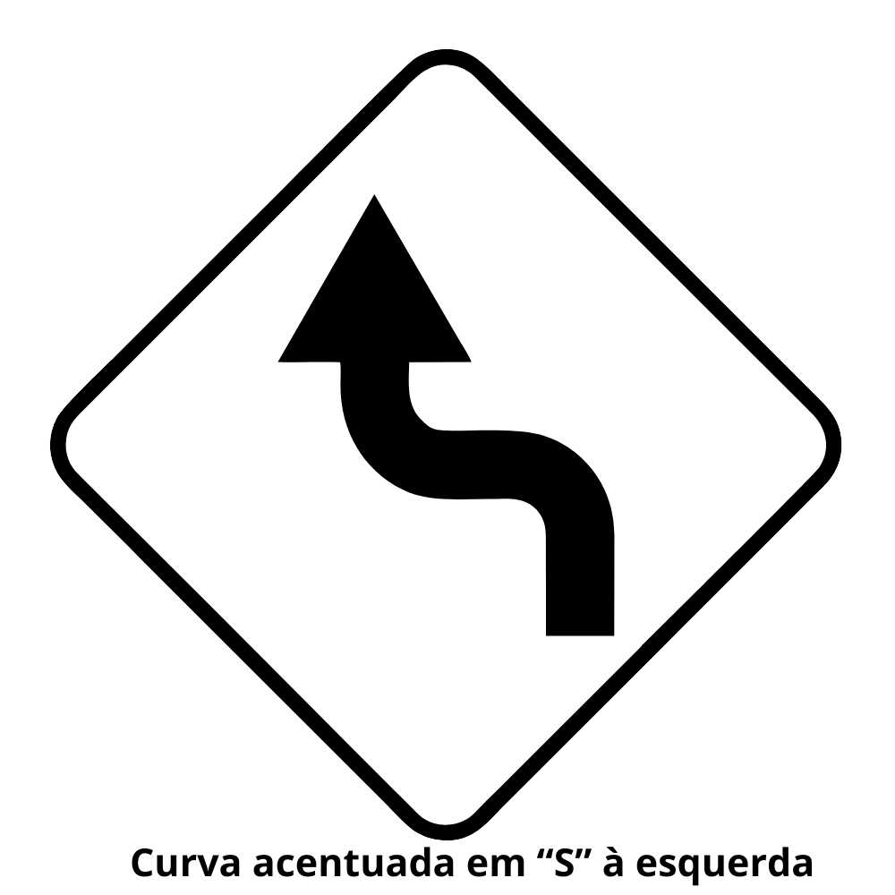 - Placas de Advertência: Placa de curva à esquerda/direita, travessia de pedestres, lombada, etc.