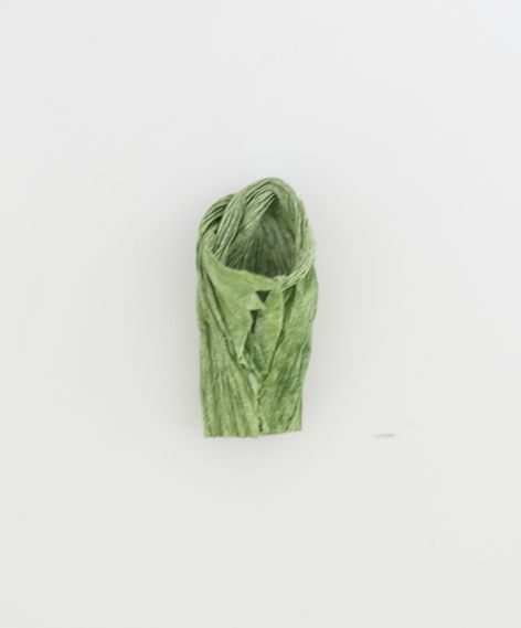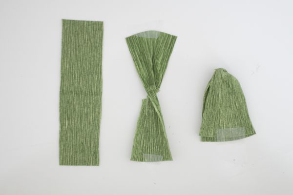 Em seguida, torça o centro de uma tirinha de papel crepom e, depois, dobre ao meio a tira de papel crepom.