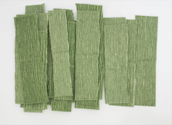 Comece separando todos os materiais que você vai utilizar em seu artesanato. Depois corte muitas tirinhas de papel crepom verde.