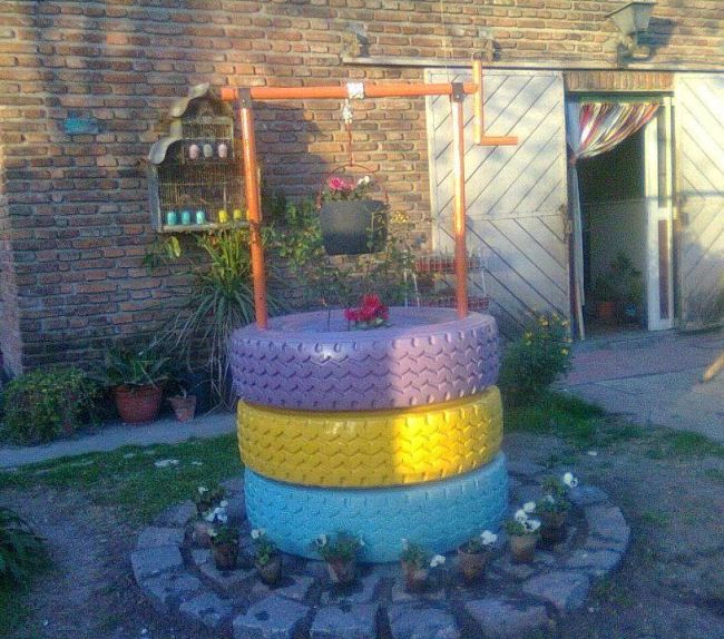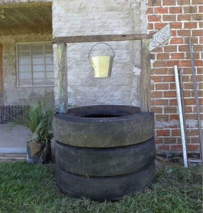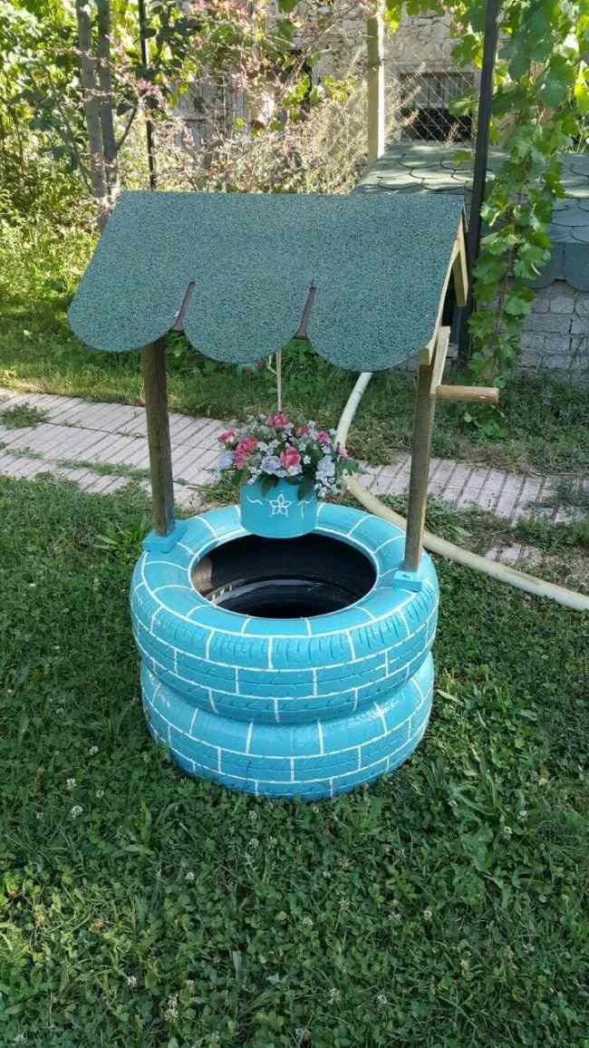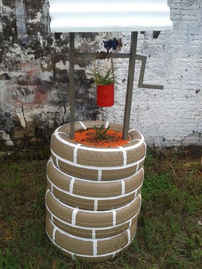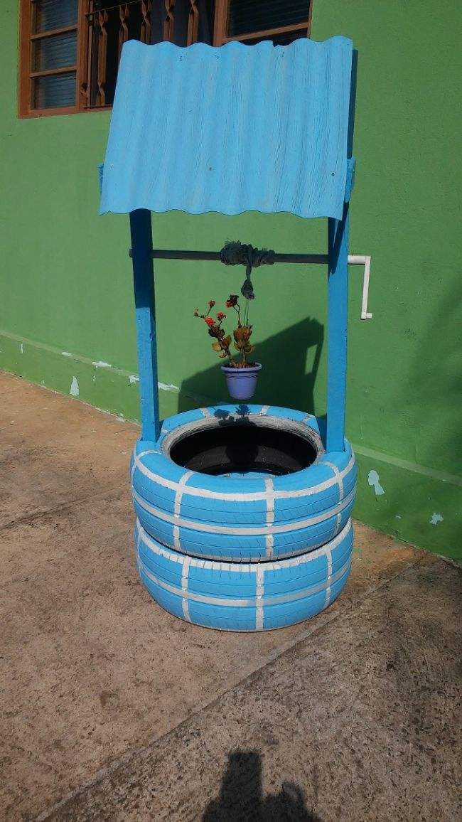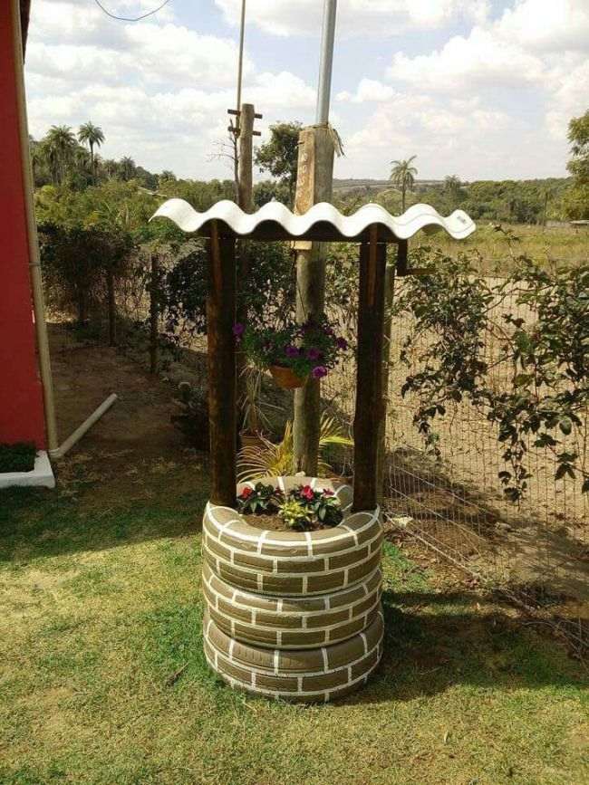 Com pneus velhos você pode criar um poço para decorar o seu jardim. Este poço pode ter os pneus em sua versão original, sem pintura, ou serem pintados, para que o seu poço fique ainda mais fofo.