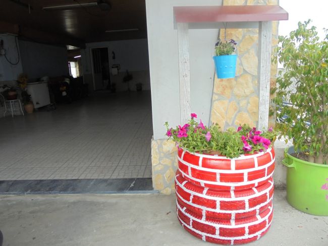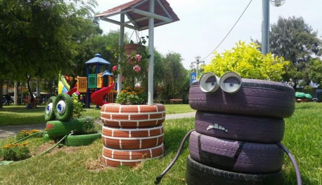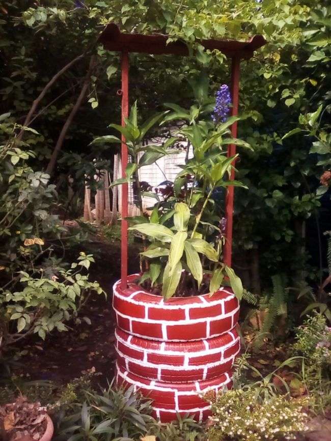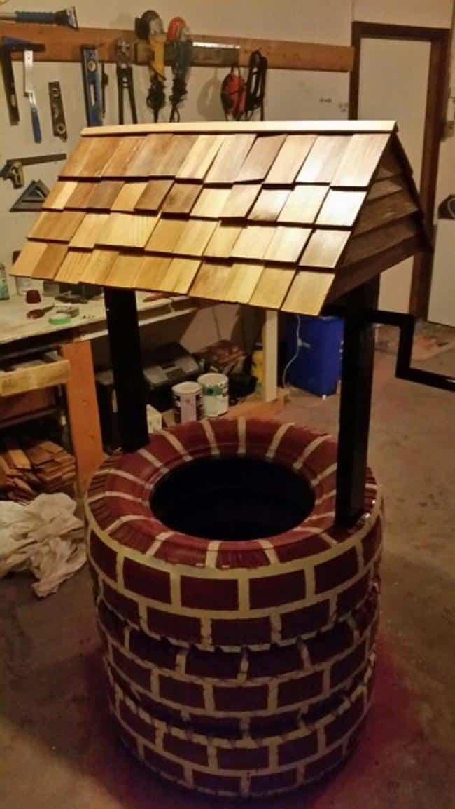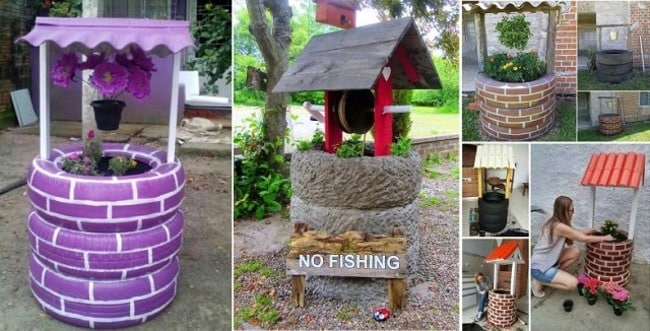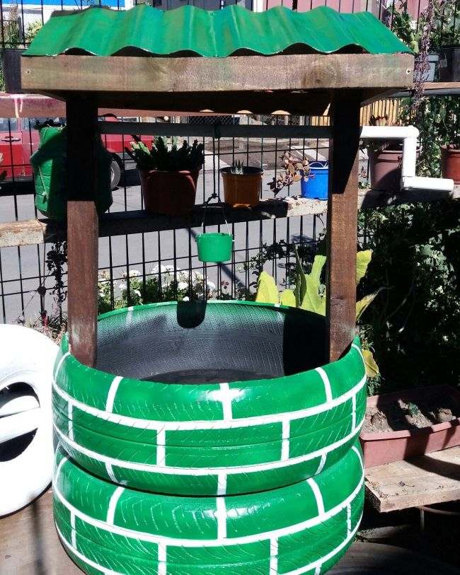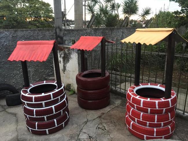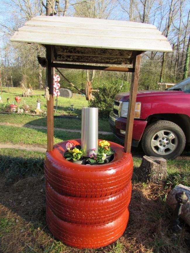 Com pneus velhos você pode criar um poço para decorar o seu jardim. Este poço pode ter os pneus em sua versão original, sem pintura, ou serem pintados, para que o seu poço fique ainda mais fofo.