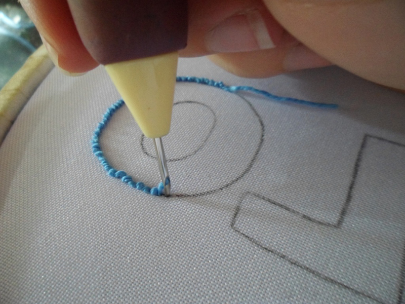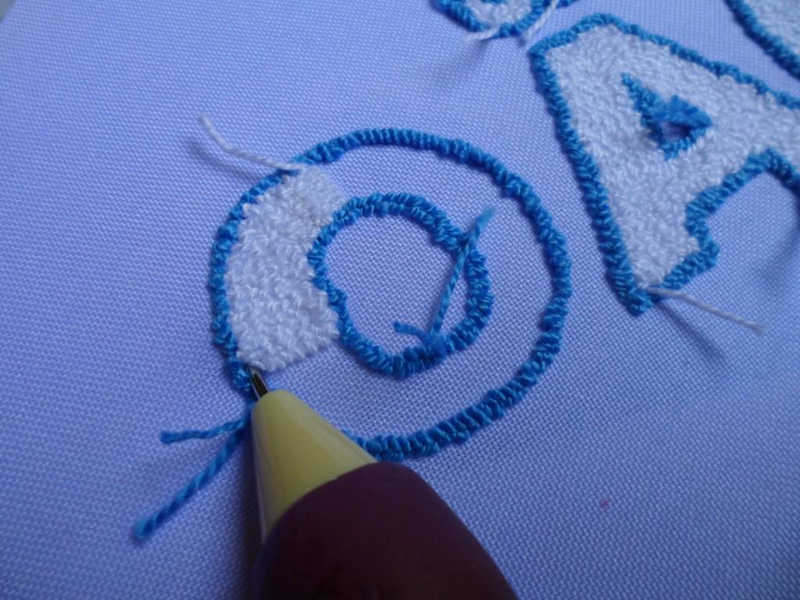 Passe a linha pela agulha, deixe uma sobra na ponta, faça um nó e comece a perfurar o tecido com a ponta da agulha. Vá fazendo os pontos, mas sempre mantendo o mesmo tamanho para os pontos. Como é uma letra e a linha é fina, faça duas carreiras para contornar a letra.