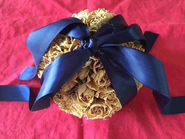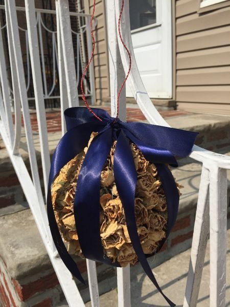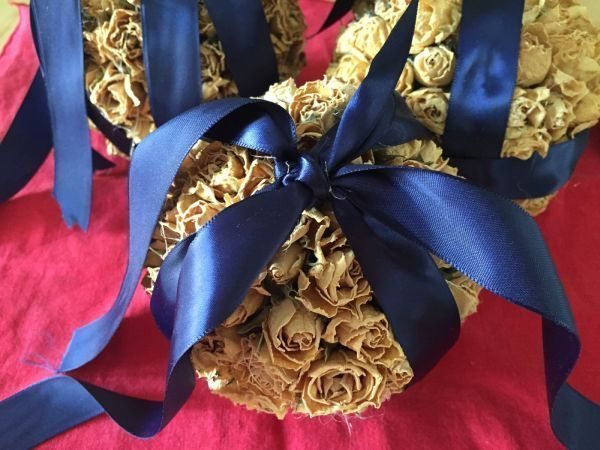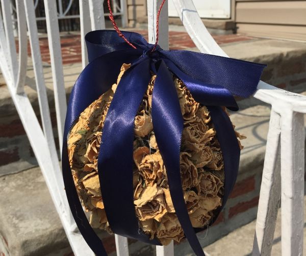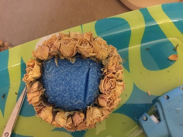 Agora, comece a colar as rosas artificiais escolhidas ao redor da sua peça criada ou ao redor de uma bola de isopor. Nesta etapa também utilize a pistola de cola quente.