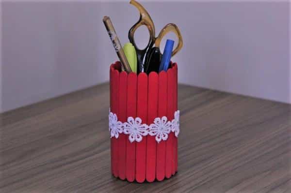 Um porta caneta personalizado fácil e bonito de fazer é o que você vai aprender agora, você poderá usar para decorar os ambiente de sua casa e deixar seu material bem separadinho. Nós fizemos esse em vermelho, mais você poderá variar com a cor do seus gosto e até mesmo fazer um porta canetas bem colorido. A seleção da renda central também pode ser modificado, você pode usar fita de cetim, barbantes, o que você preferir para decorar seu porta canetas,veja como ficou um mimo: