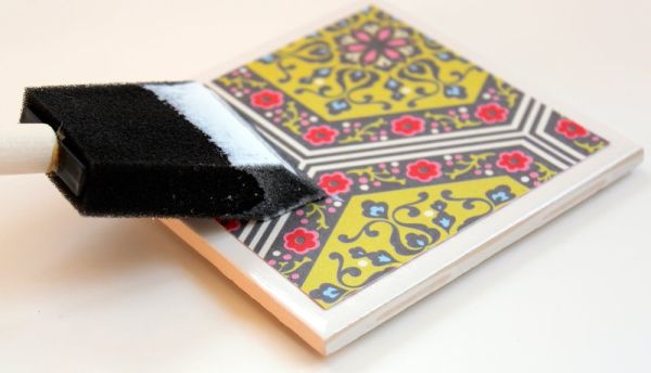 Em seguida, aplique a cola para decoupage sobre toda a parte de cima do azulejo, com o auxílio do pincel com esponja.