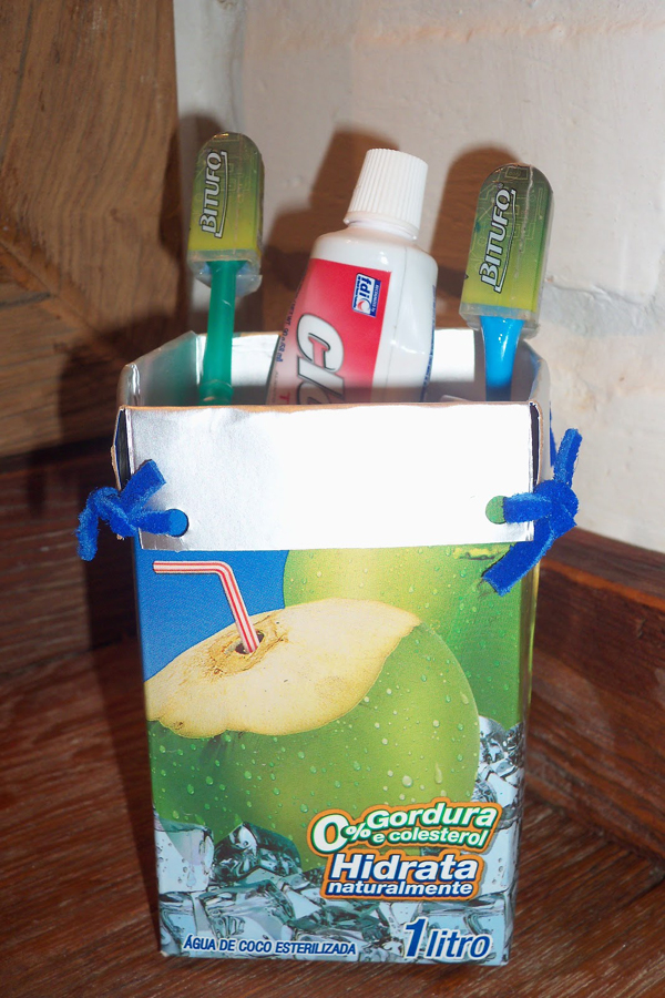 Há outras formas de fazer porta escova de dente, como o processo de como fazer um porta escova de dente com caixa de leite, que basta dobrar a borda para baixo e amarrar. Vale usar caixa de suco ou caixa de água de coco, também.