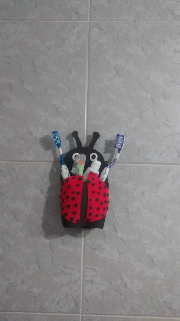 O processo de como fazer porta escova de dente de EVA pode ter também as tampas das garrafas pet usadas anteriormente. Fixe na parede o EVA, com uma fita dupla face bem resistente.