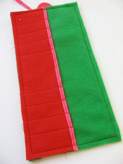 Posicione o bolso sobre uma das partes principais e marque onde você vai costurar para criar as divisórias. Faça quantas divisórias forem necessárias para você acomodar todos os seus gizes. Se você quiser, faça uma divisória maior no meio, para acomodar também um bloquinho de notas.
